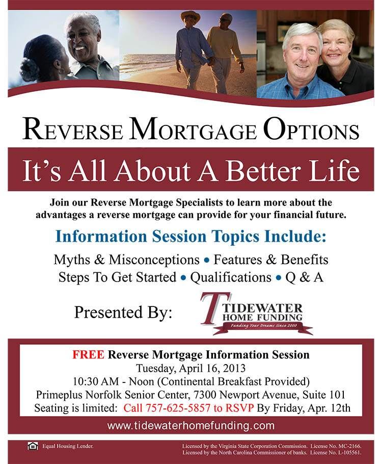 FREE Reverse Mortgage Information Session Tuesday, April 16th (10:30 am - Noon). Primeplus Norfolk Senior Center. Call 757-625-5857 to RSVP.