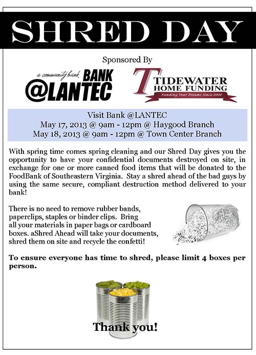 Spring is great as long as you don't mind the sniffles from the pollen and all the dust you're stirring up while doing you spring cleaning! This year Tidewater Home Funding is partnering with Bank @LANTEC to help you tidying up.  Shred Days are May 17 & 18. All you have to do is bring 1 or more canned food items to donate to the FoodBank of Southeastern Virginia and we'll let you shred 2 boxes of confidential paperwork for FREE! You're staying a shred ahead of the bad guys and helping the hungry. Can you say win-win? Call 757.671.7900 ext. 112 for more information.