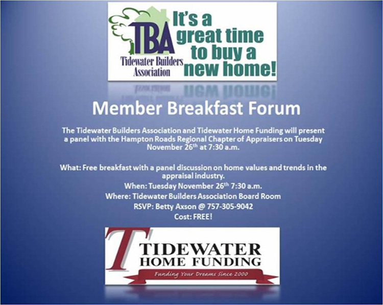 TBA Member Breakfast Forum. Tuesday, November 26th at 7:30 am. Presented by Tidewater Builders Association & Tidewater Home Funding. RSVP by calling 757-305-9042.
